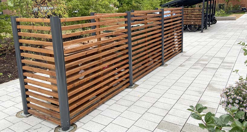 Das Tragsystem der Fahrradabstellanlage „Ymer“ und der Abschirmung „Thebe“ mit einem gewählt dunklen Grau als Farbgebung für die Aluminium-Bauteile, paßt sich elegant den neuen Fenstern des anliegenden Gebäudes an. Die Wandfüllungen mit Holzlamellen aus Kiefernholz natur korrelieren angenehm mit der frisch sanierten Klinker-Fassade. Aus der Wohnung von oben betrachtet, schmiegt sich der Pflanzbewuchs des Daches in die Grünanlagen ein. Die eingestellten Fahrräder und Container sind geschützt und der dafür vorgesehene Raum ist gut geordnet. Von allen Seiten einsehbar, lassen Ymer und Thebe sogleich ihren jeweiligen Zweck erkennen und entsprechen dabei dem Sicherheitsgedanken einer sozialen Überwachung, zur besseren Eindämmung von Fahrraddiebstahl und Mülltourismus. Der Optik wurde genüge getan, was ist mit der Instandhaltung?