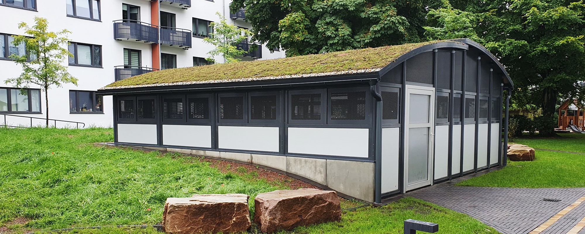 Die von SRC Landschaftsarchitektur als Planungsbüro im Auftrage der STÄWOG an die Weland GmbH in Lübeck gestellte Aufgabe lautete auf eine hochwertige Einhausung zum Zwecke der Sicherung der Fahrzeuge der Mieter, sowie der geschützten Aufnahme von Recyclingbehältern. Gleichzeitig sollte sich die Form des Daches in das gänzlich neu gestaltete Gelände mit organischen Höhenverläufen, sowie neuer Bepflanzung einpassen. Auf diese Weise kann die mit dem Modell Tellus Duo 80-4 gewählte Einhausung aus dem Hause Weland den zentralen Blickpunkt des Innengeländes bilden, ohne durch seine Funktion störend zu wirken.