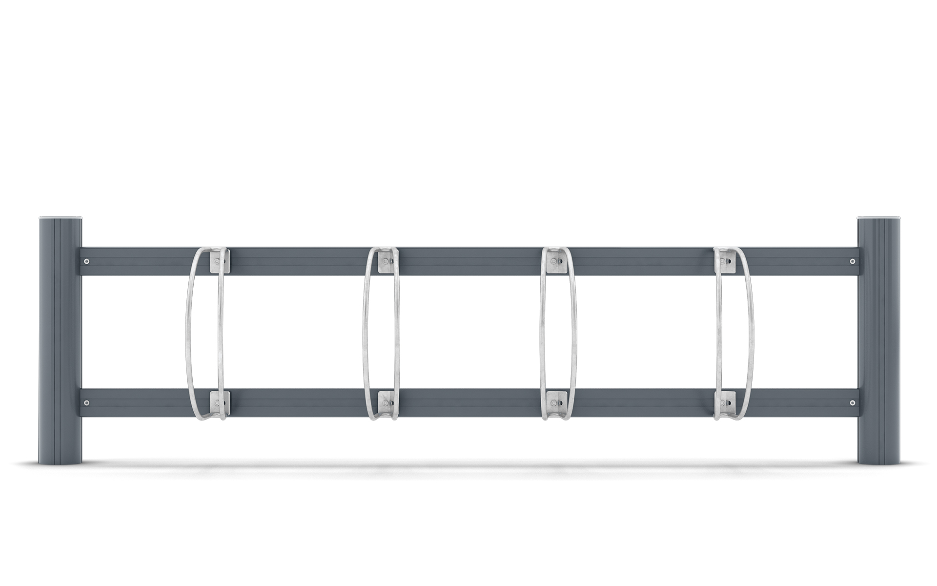Eine Fahrradabstellanlage, bei der Fahrräder auf beiden Seiten abgestellt werden können. Ist in zwei Standardgrößen mit 2000 mm oder 2500 mm c/c erhältlich. Die Verankerung am Boden erfolgt mit Betonblöcken oder Fußplatte für eine gegossene Platte.