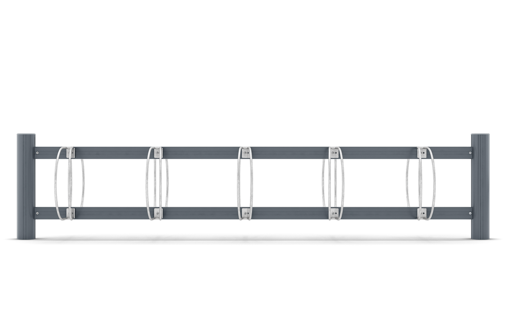 Wählen Sie zwischen einer schwarzen Kunststoffabdeckung oder einer massiven Aluminiumkugel als Pfostenaufsatz. Die kleinste Größe bietet Platz für fünf Fahrräder, und jeder weitere Abschnitt von zwei Metern bietet Platz für weitere fünf Fahrräder.