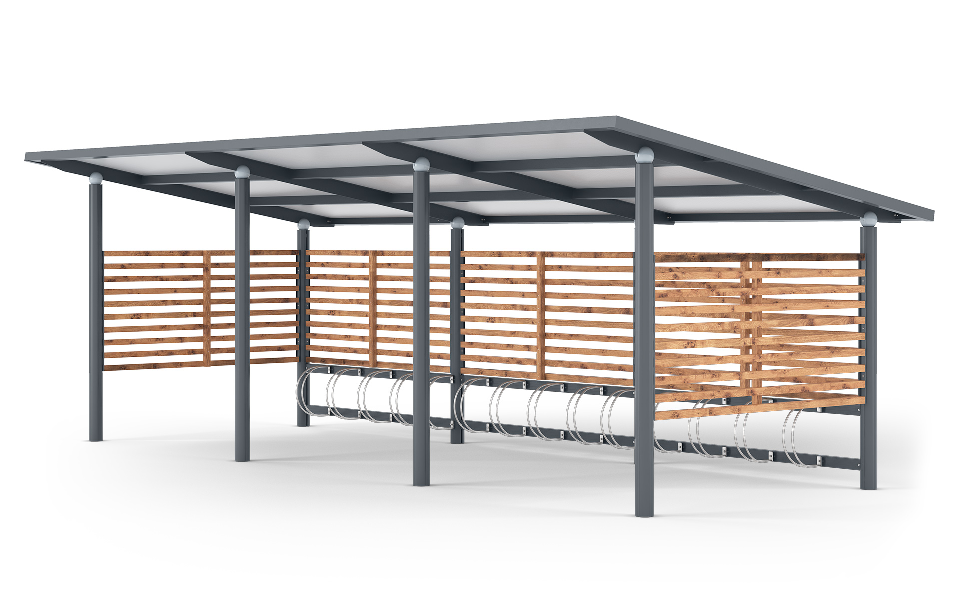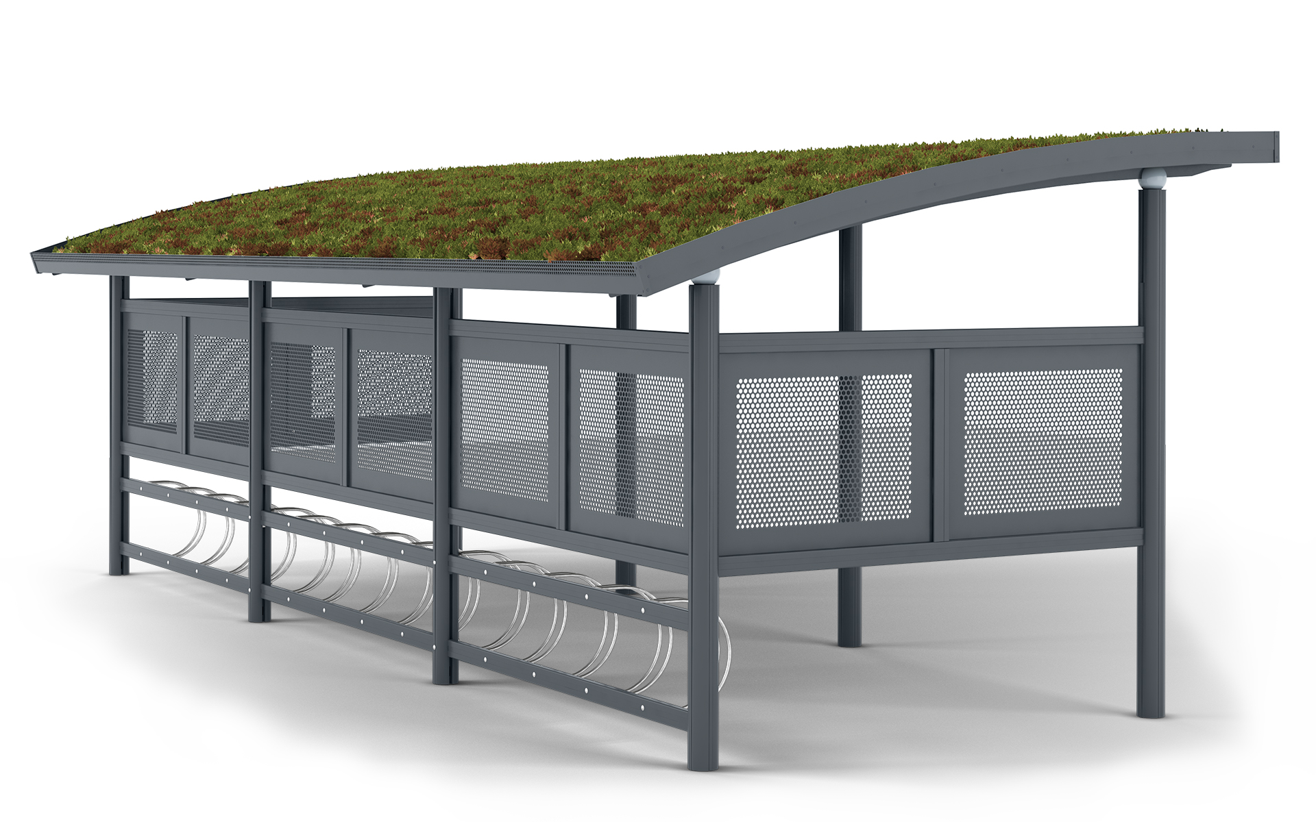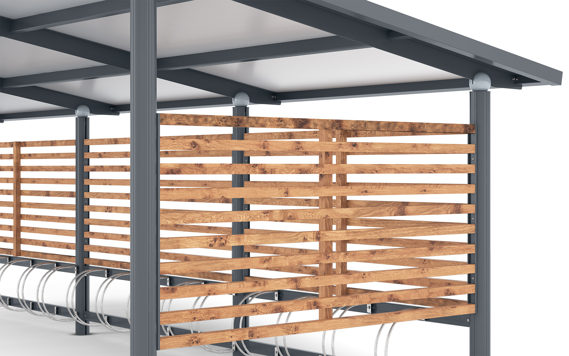 Der Fahrradunterstand ist in einer Standardausführung erhältlich, die je nach Bedarf mit unterschiedlichen Optionen angepasst werden kann. Die Optionen müssen zusammen mit dem Fahrradunterstand bestellt werden.