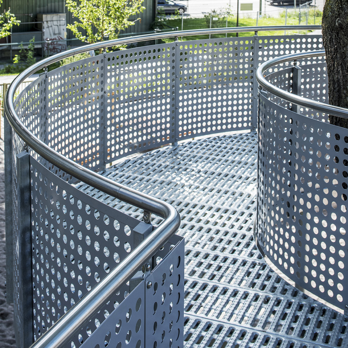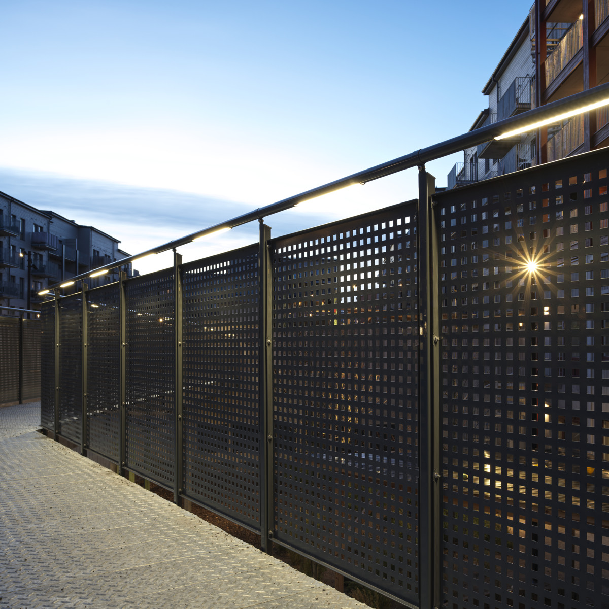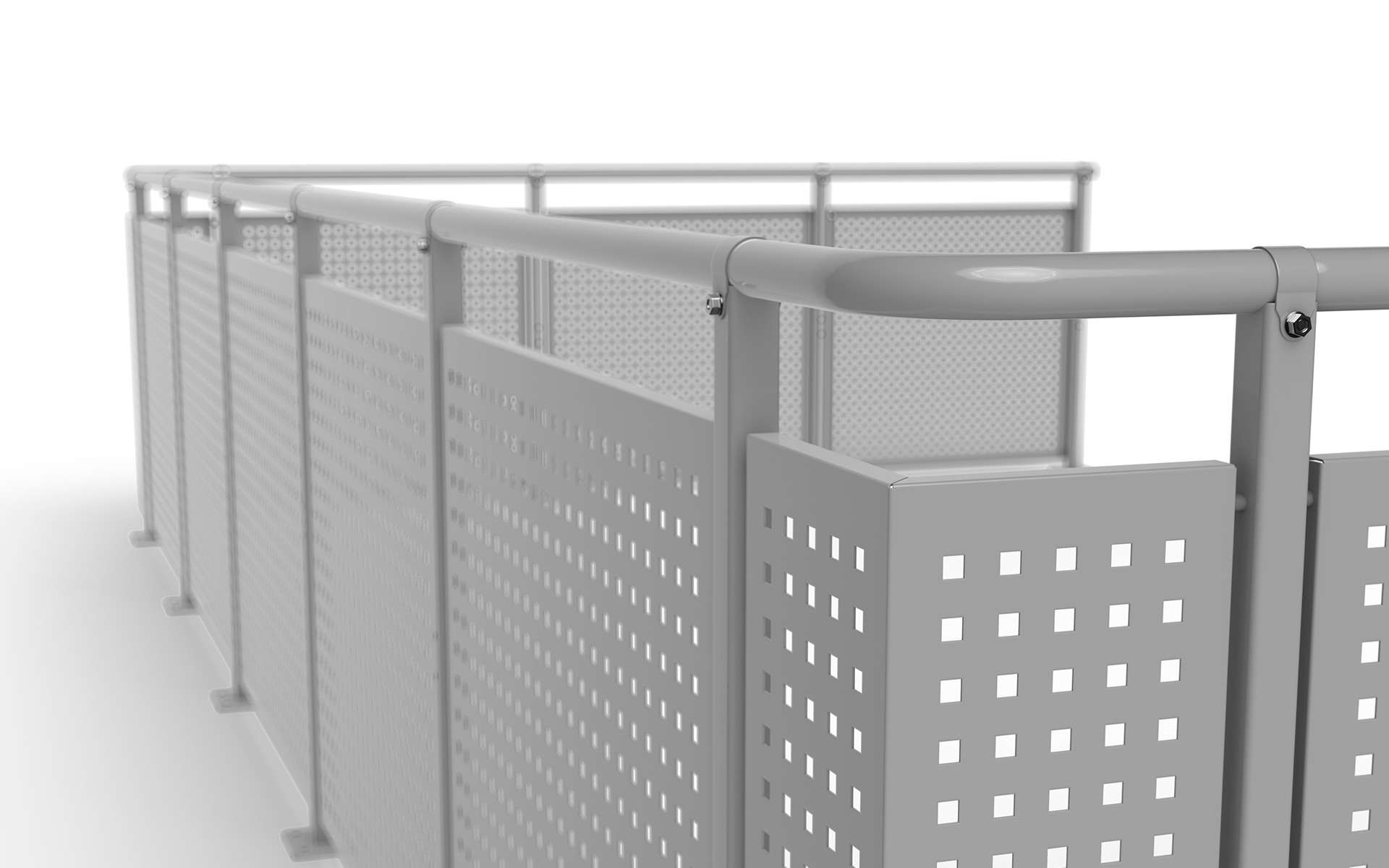 Geländer aus dichtem oder perforiertem Blech. Kindersicher mit maximaler Öffnungsweite 100 mm.