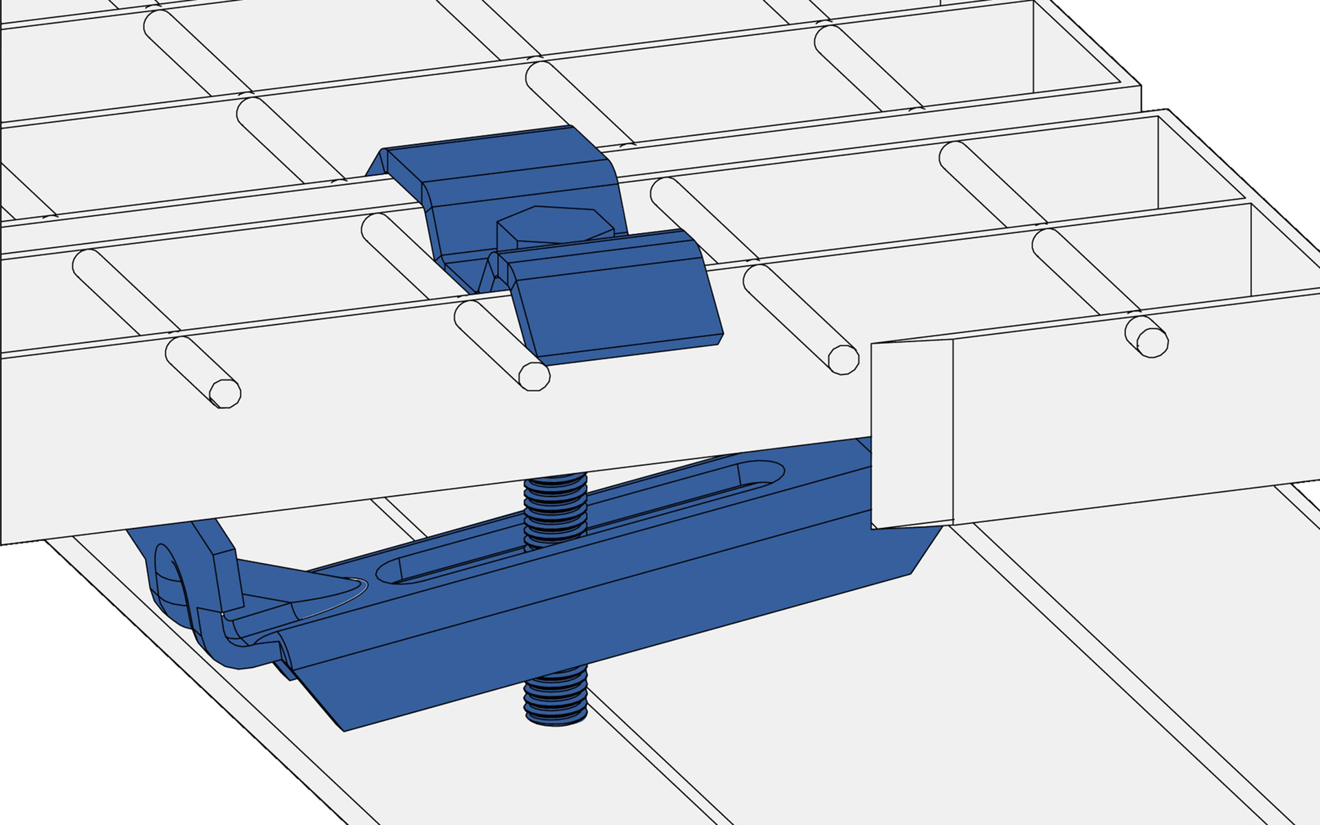 Komplette dreiteilige Klammer für die Fixierung von Schlitzgitterrosten. Oberteil, Schraube (M8) und Mutter. In den Schraubenlängen 70 und 100 mm erhältlich. In die Unterkonstruktionsträger müssen Löcher gebohrt werden.