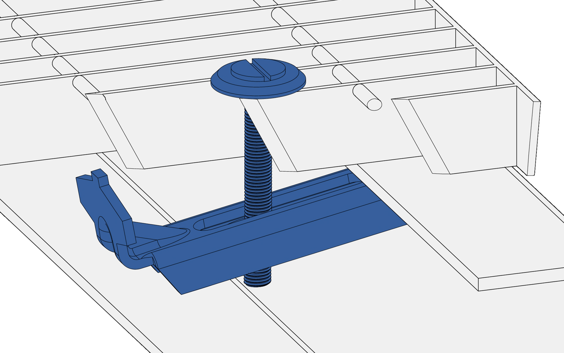 Komplette Klammer aus vier Teilen. Spezialoberteil, Unterteil, Schraube und Mutter. Erhältlich mit den Schraubenlängen 50, 60, 70 und 80 mm. Die Montage erfolgt am Untergestell ohne Bohren.