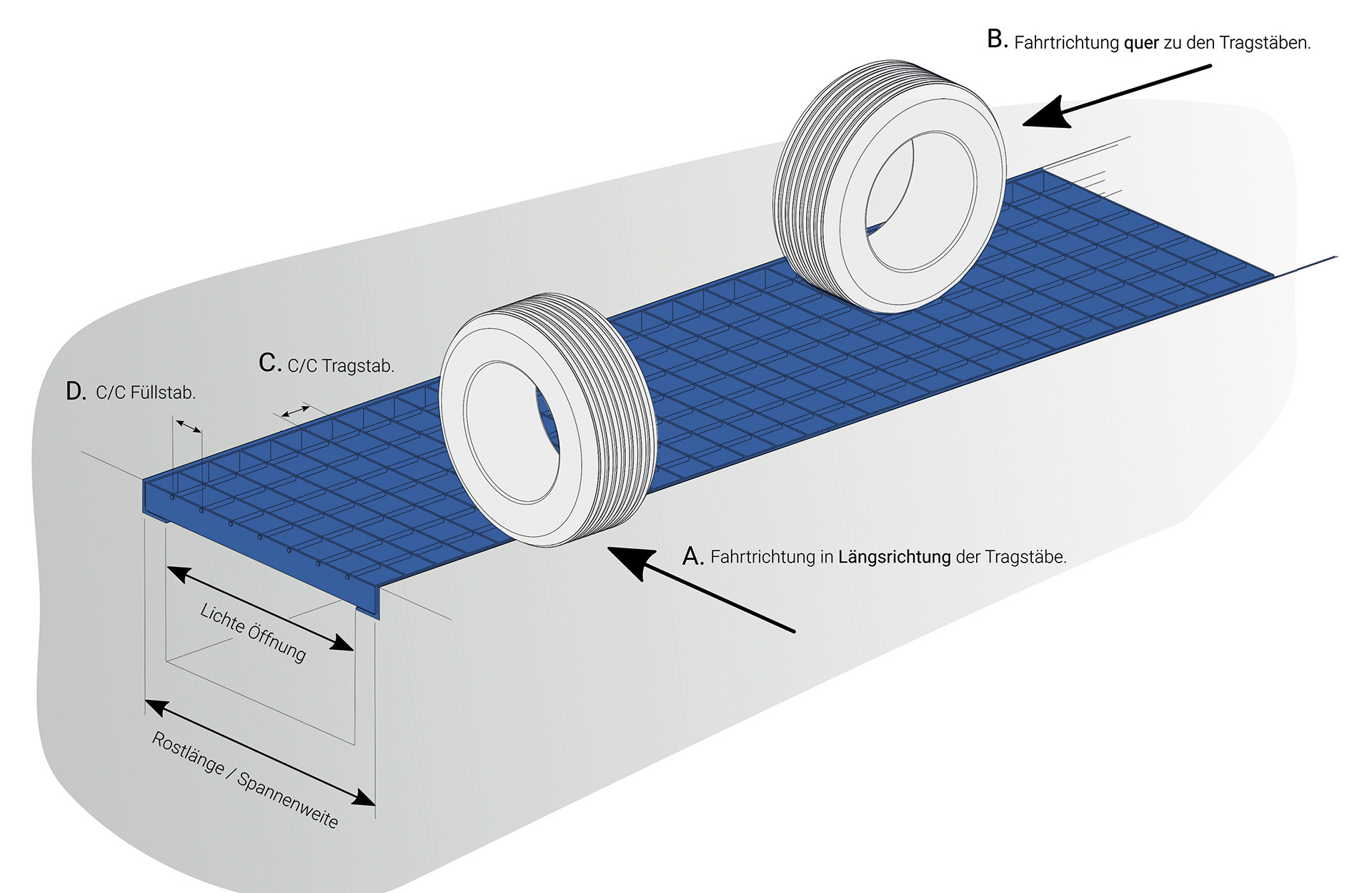 Die Tabellen unten geben Beispiele zu verschiedenen Belastungen mit Motorfahrzeugen. Die angegebene Werte sind gemäß Eurocode berechnet. Die Größe der Druckfläche sowie die Fahrtrichtung sind entscheidend für die Bestimmung der Gitterrostart und die Dimensionierung. Welands Projektierbüro hilft Ihnen gerne, wenn Sie Ratschläge benötigen oder Fragen zur Dimensionierung haben.