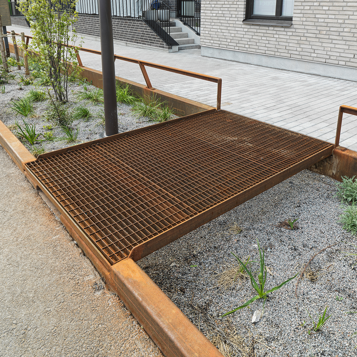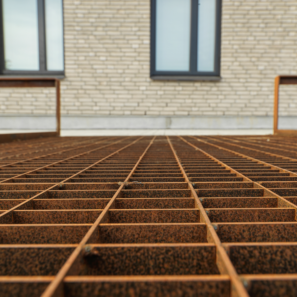 Mit unseren flexiblen Gitterrosten ist man nicht von einer bestimmten Gitterrosthöhe oder einer bestimmten Maschenweite abhängig. Die Größe der Maschen muss nicht über die gesamte Fläche gleich groß sein, was zu ganz neuen und spannenden Mustern führen kann. Stützstäbe und Tragestäbe können beispielsweise schräg gestellt werden und die Stützstäbe müssen nicht ganz auf die Tragestäbe heruntergedrückt sein , sondern können nach Ihren Wünschen in beliebiger Höhe bestellt werden. Auch das Material, aus dem wir die Gitterroste herstellen, begrenzt uns nicht. Wir können Gitterroste aus mehreren verschiedenen Materialien wie z. B. Corten herstellen.