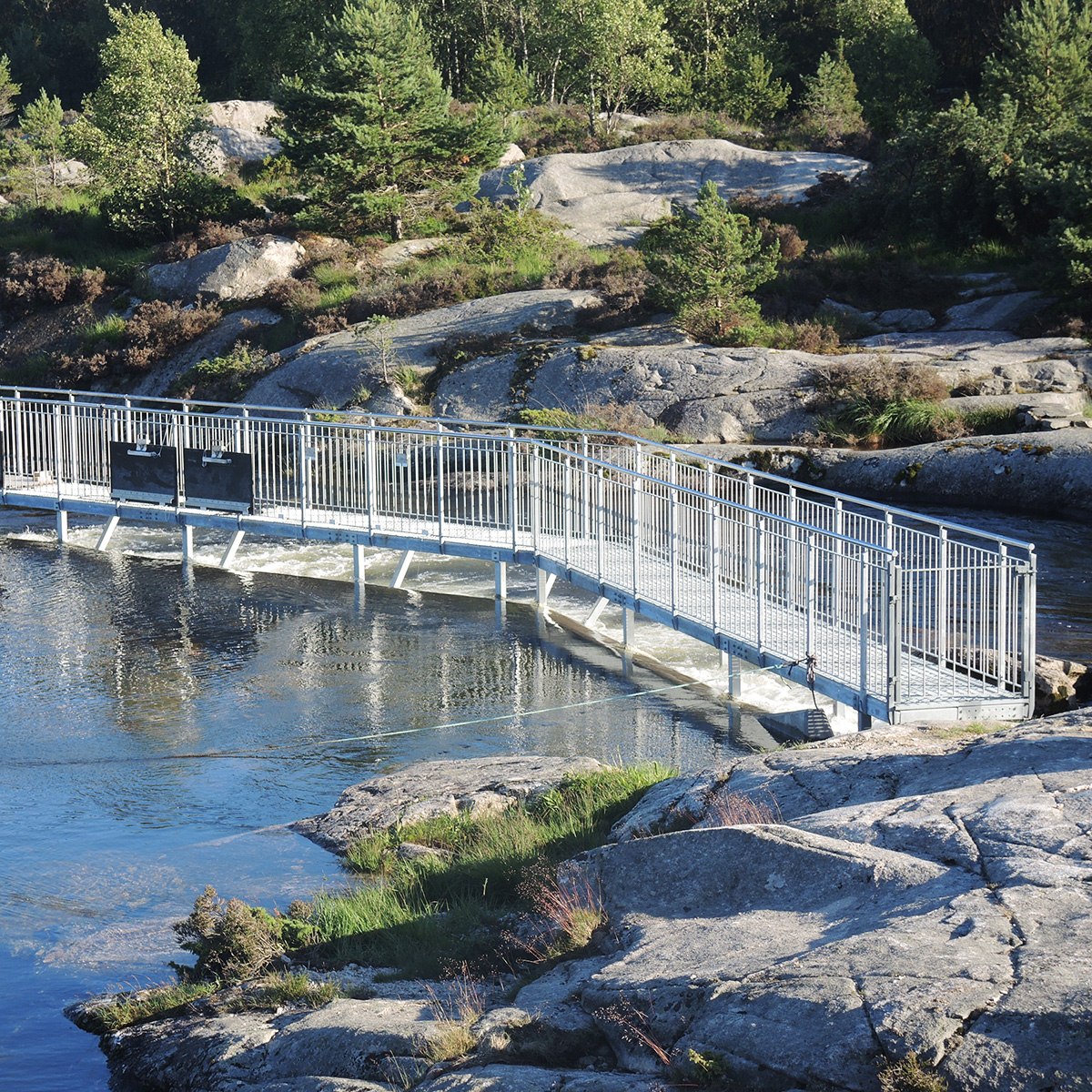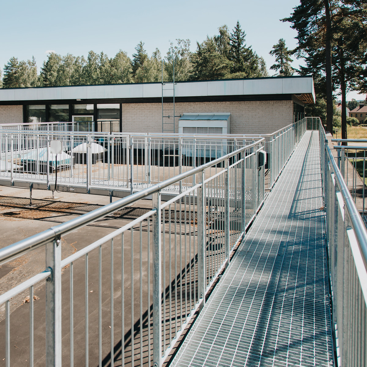 Das Geländer für den Laufsteg "Flex" ist unser bewährtes Sektionalgeländer. Verschiedene Ausführungen stehen zur Auswahl. Handlauf und Knieleiste bestehen aus "walzblanken" Ø 42 mm Edelstahlrohr.