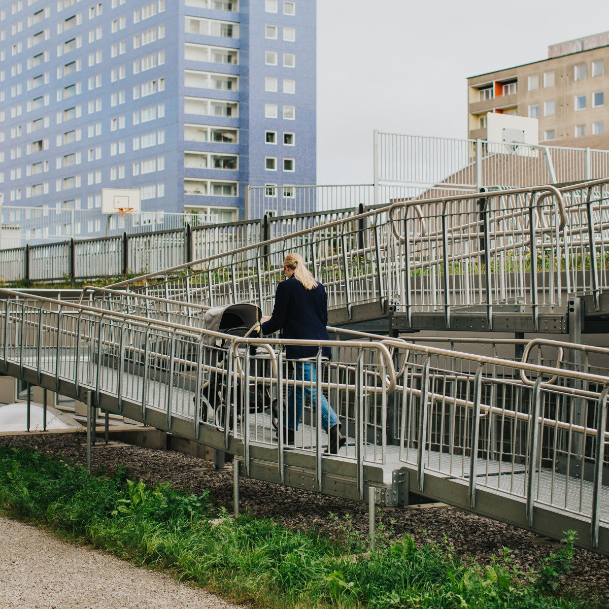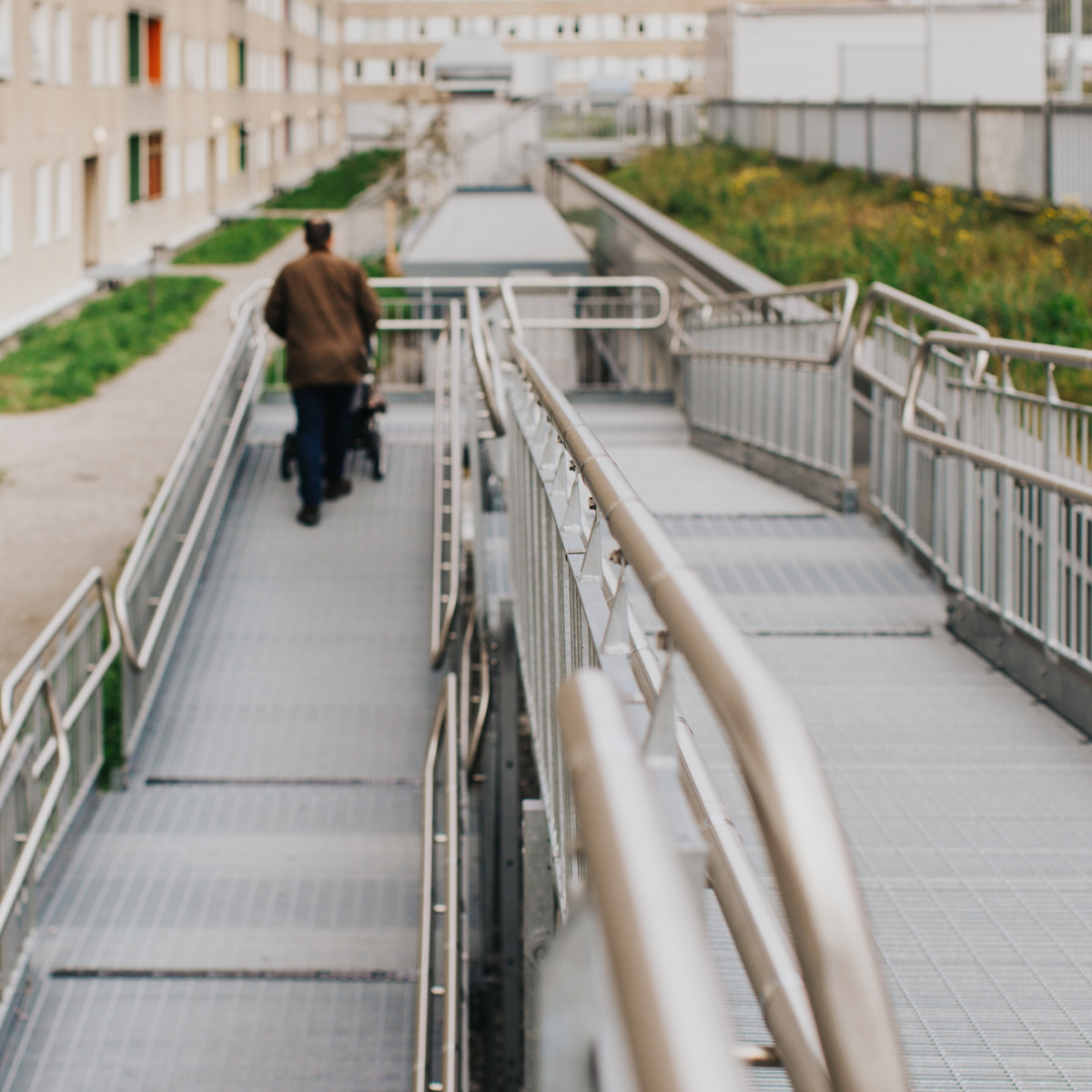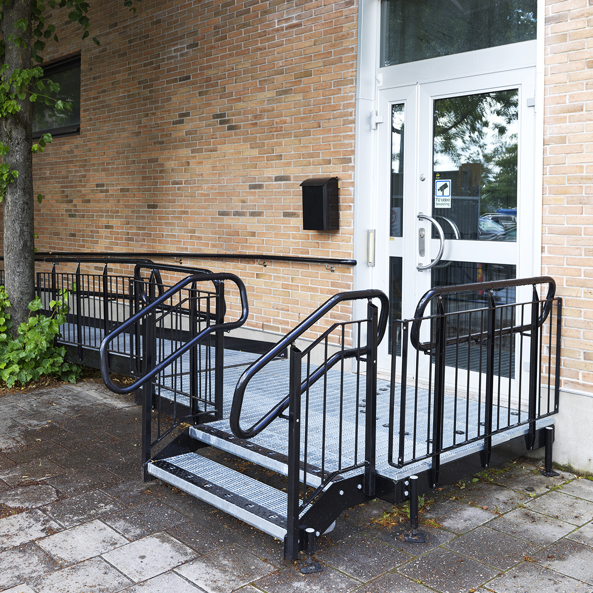 Rollstuhlrampe, versehen mit Geländer auf einer Seite und mit an angrenzender Wand montiertem Handlauf.
