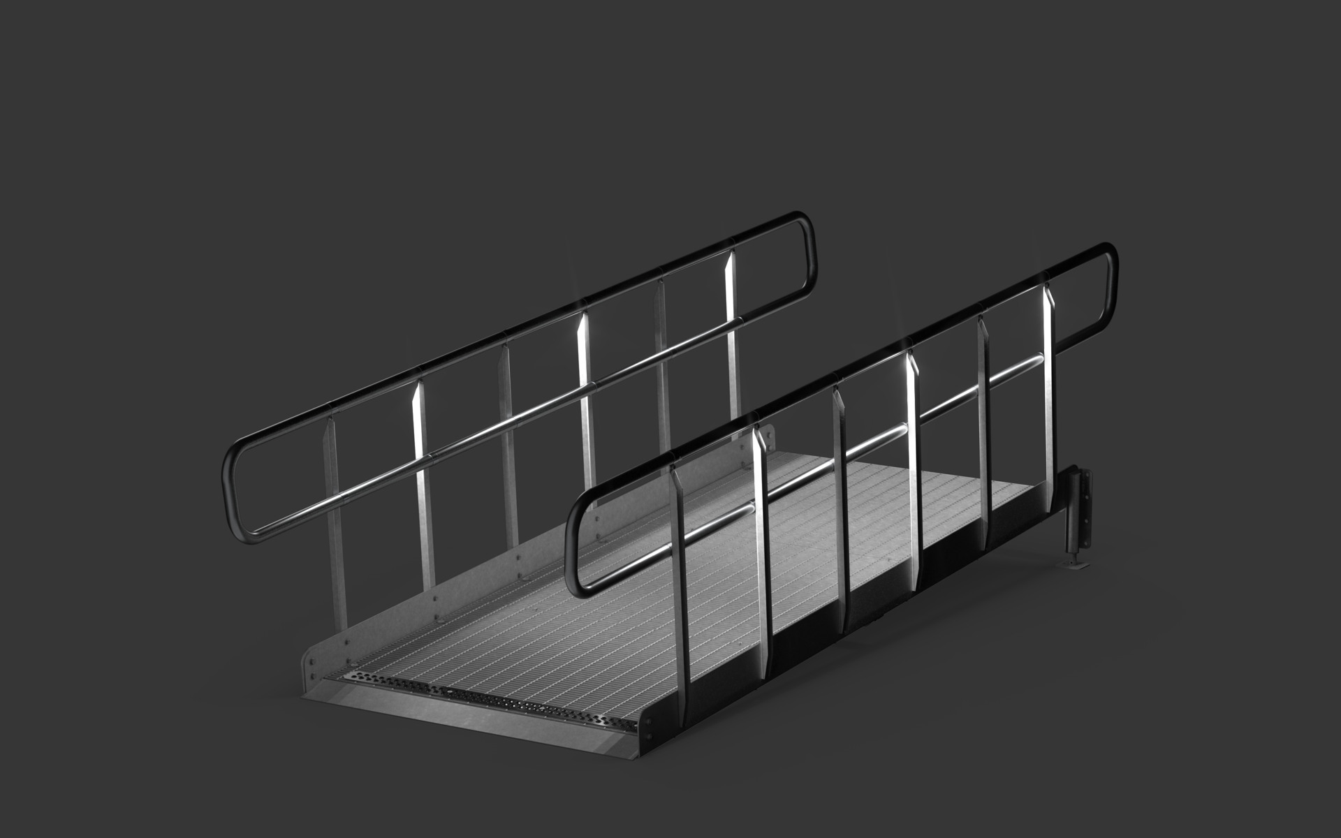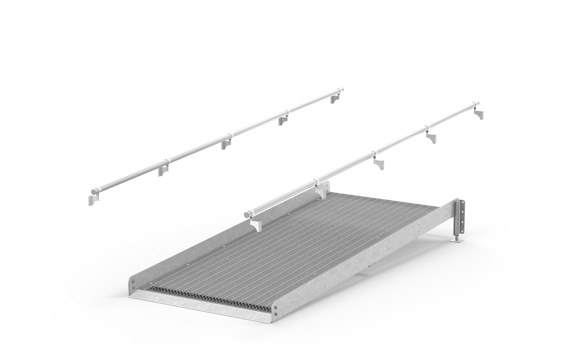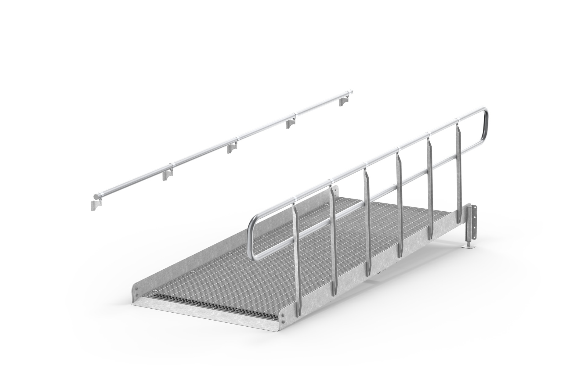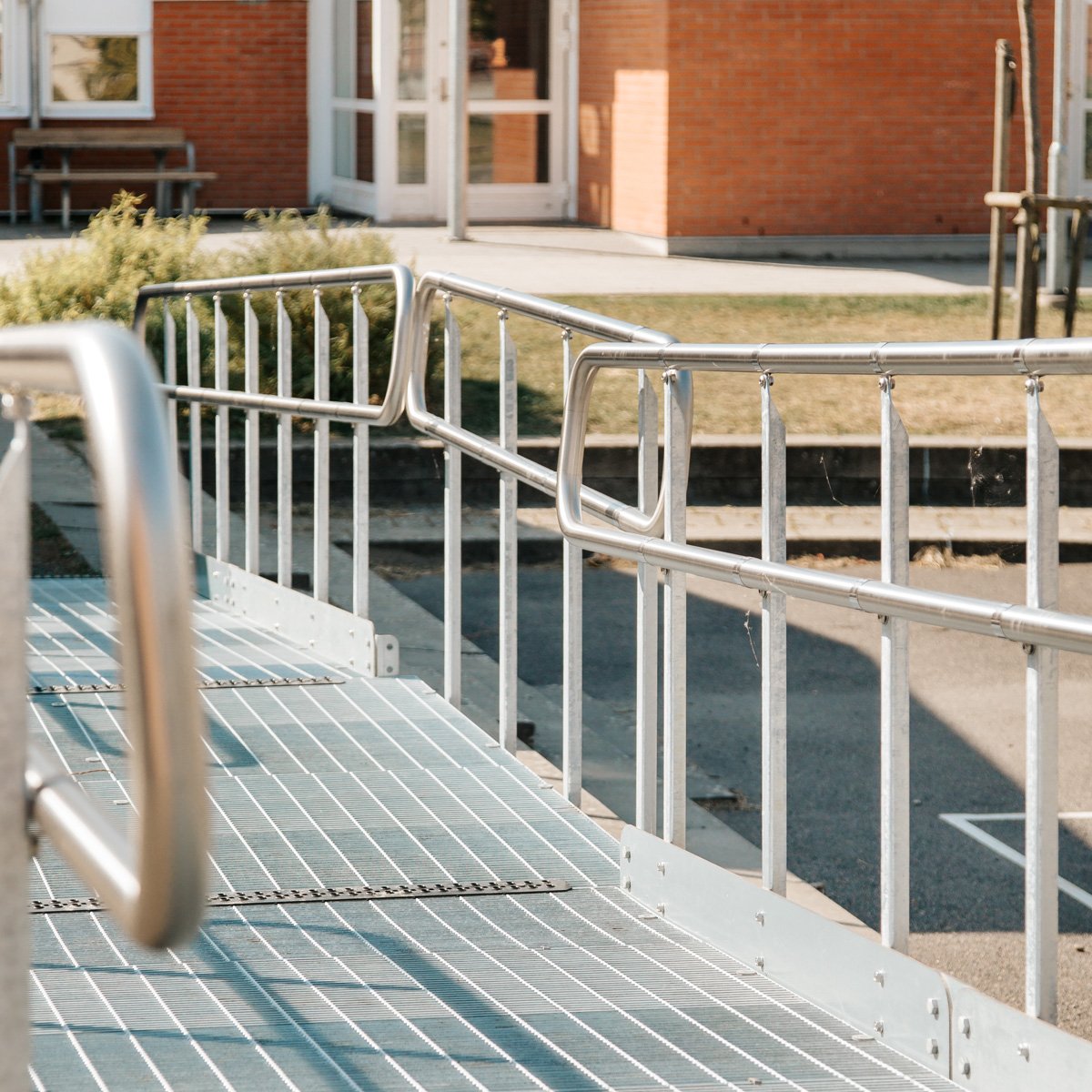 Um die Zugänglichkeit und Sicherheit zu verbessern, können die Rampen mit Handläufen versehen werden. Der Handlauf wird an der Wand angebracht.