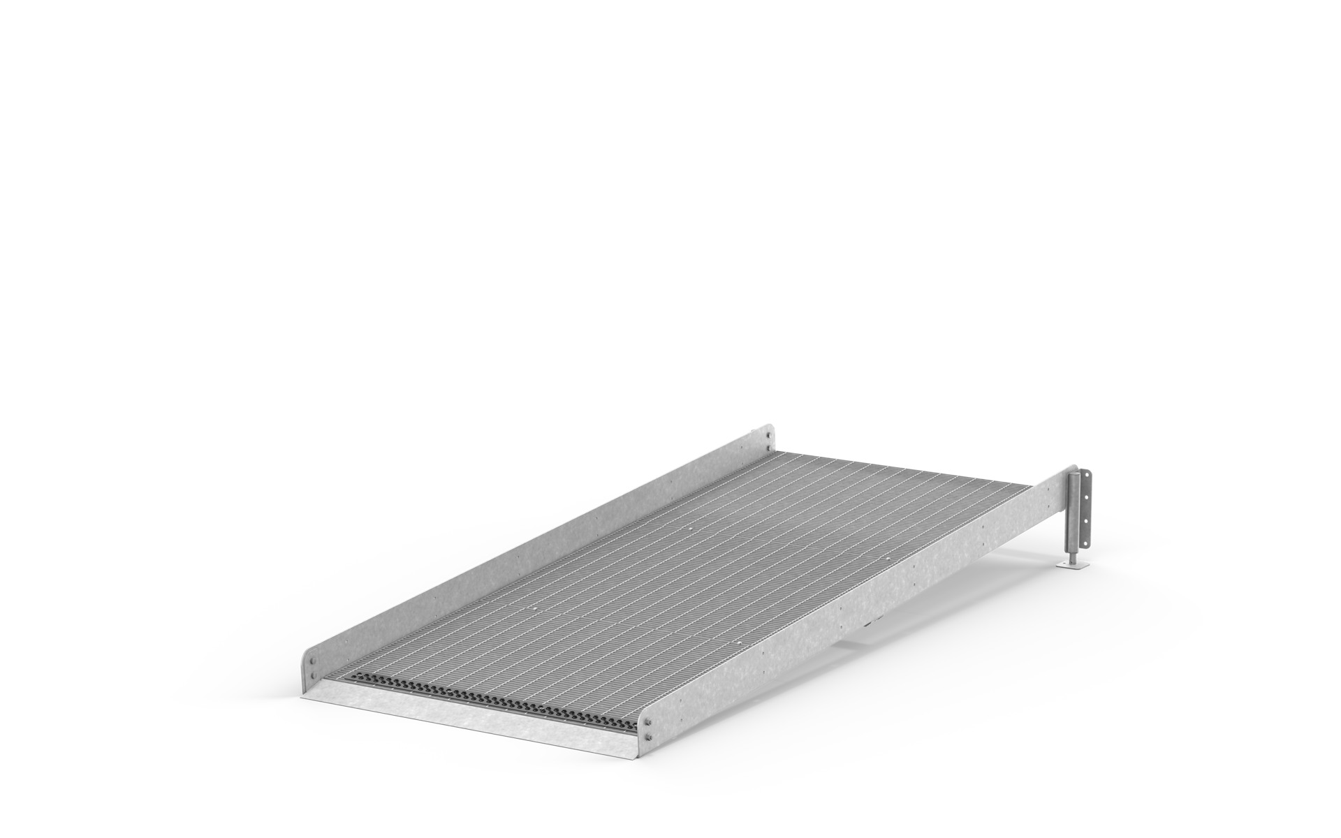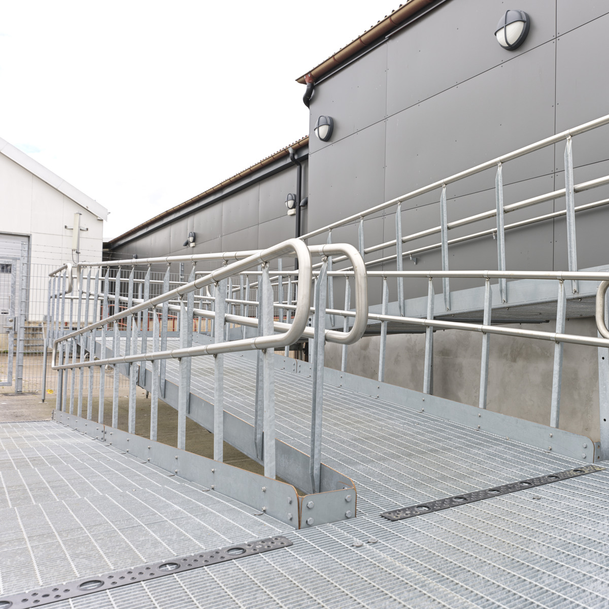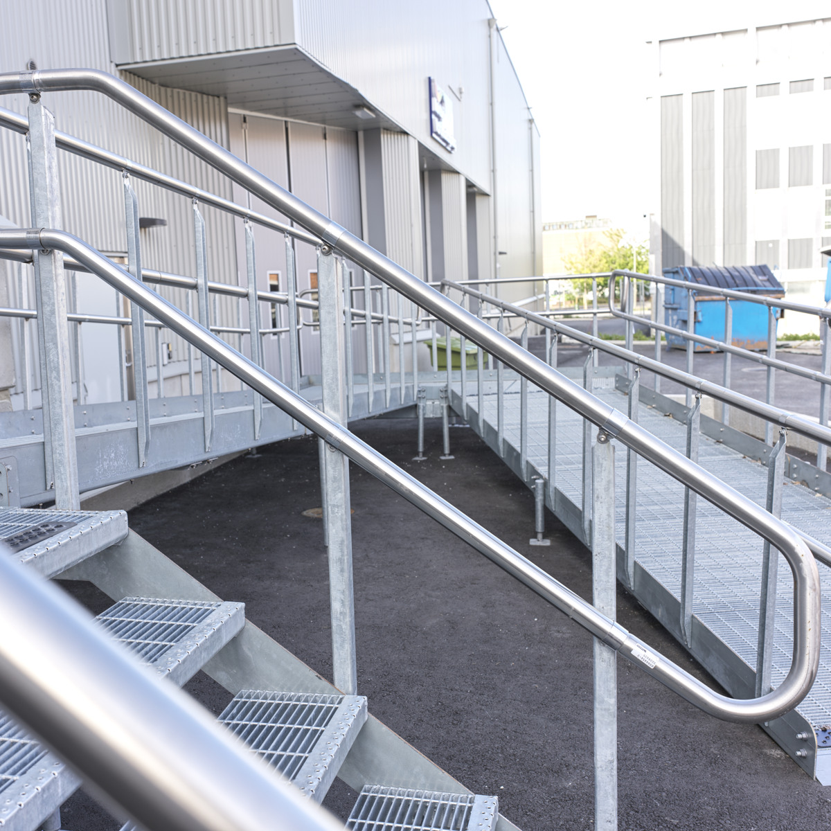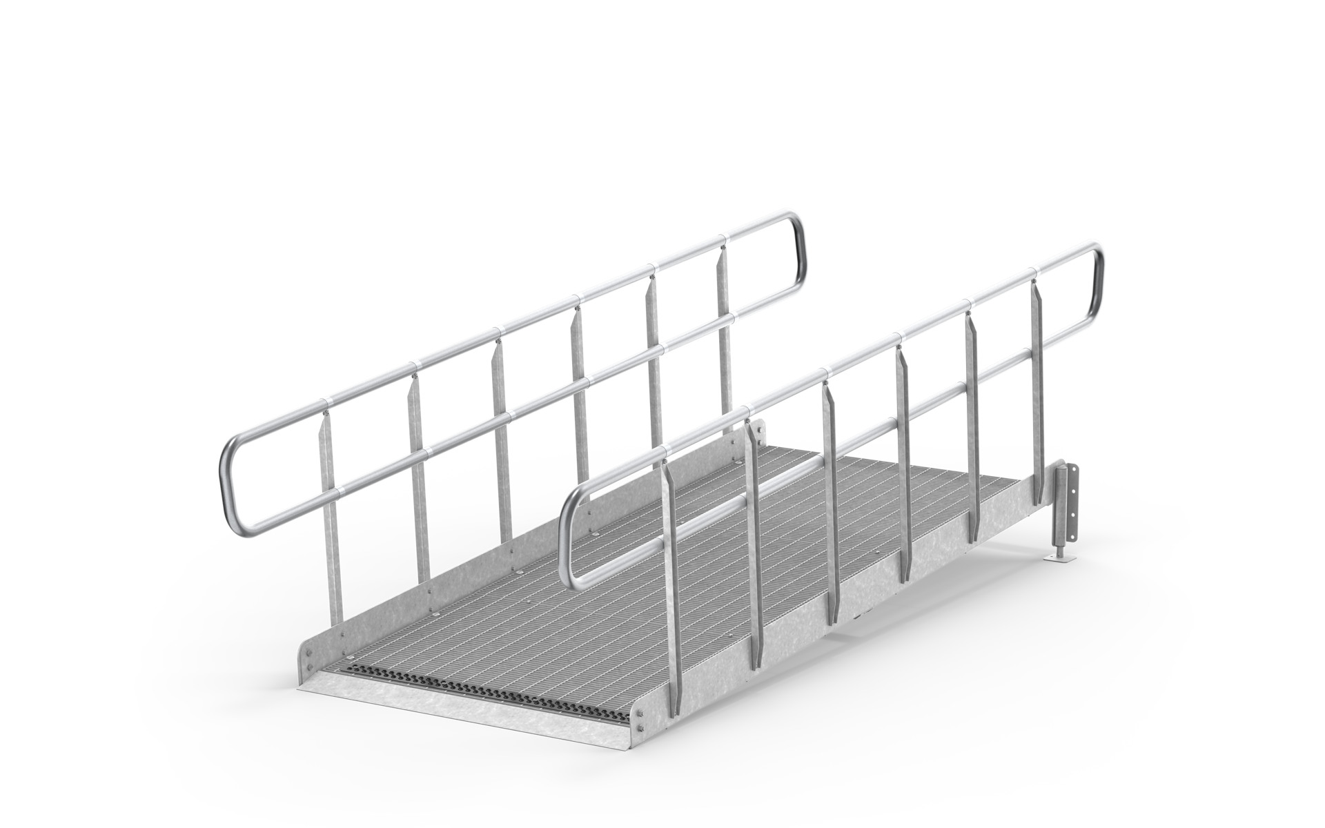 Unsere kompletten Rollstuhlrampen werden mit Gitterostbelag (Typ: SP-Rost, MW: c/c 17x75 mm) inkl. Handlauf (aus walzblankem Edelstahl), Wangen und verstellbaren Stützbeinen zum Lager vorproduziert. Die Baugruppen werden nach DIN EN-ISO 1461 verzinkt. Die Neigung der Rampen ist dank der verstellbaren Stützbeine einstellbar. Im öffentlichen Bereich sollten 6% Neigung eingehalten werden. Optional kann eine Kontrastmarkierung an der Vorderkante der Rampe und am Anfang des Podestes angebracht werden. Vorgefertigte Baugruppen gewährleisten kurze Lieferzeiten und eine schnelle Montage.