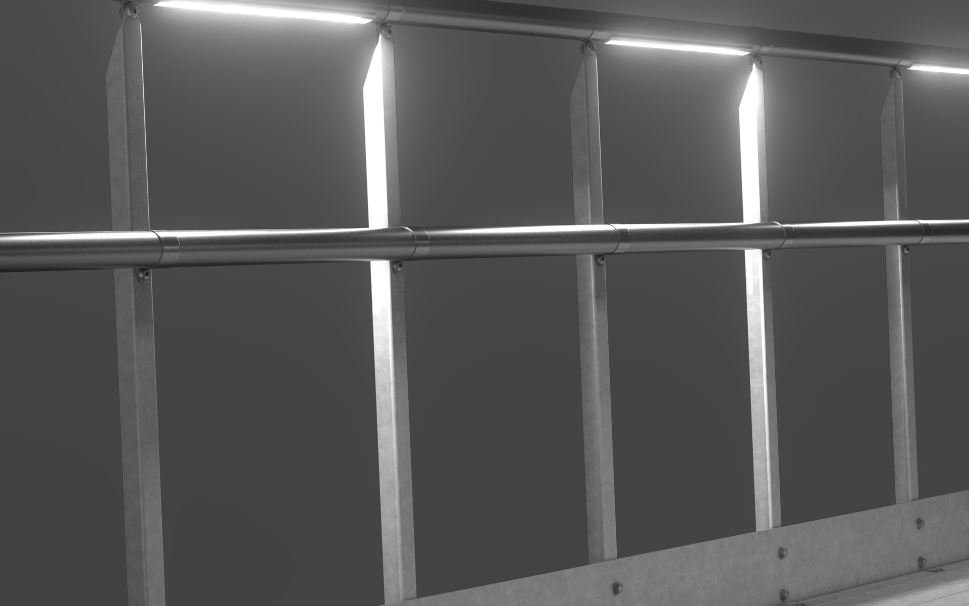 Auf Anfrage bieten wir auch werkseitig vorgerichtete Handläufe für den Einbau mit einer Weland LED-Beleuchtung an. Die Beleuchtung sorgt für einen sicheren Verkehrsweg. Bedingt durch die Lage der Beleuchtung an der Unterseite des Handlaufes kann es durch den zweiten Handlauf zu einem leichten Schattenwurf auf dem Gitterrost kommen.