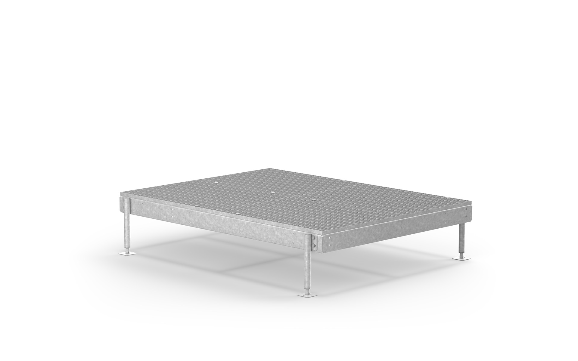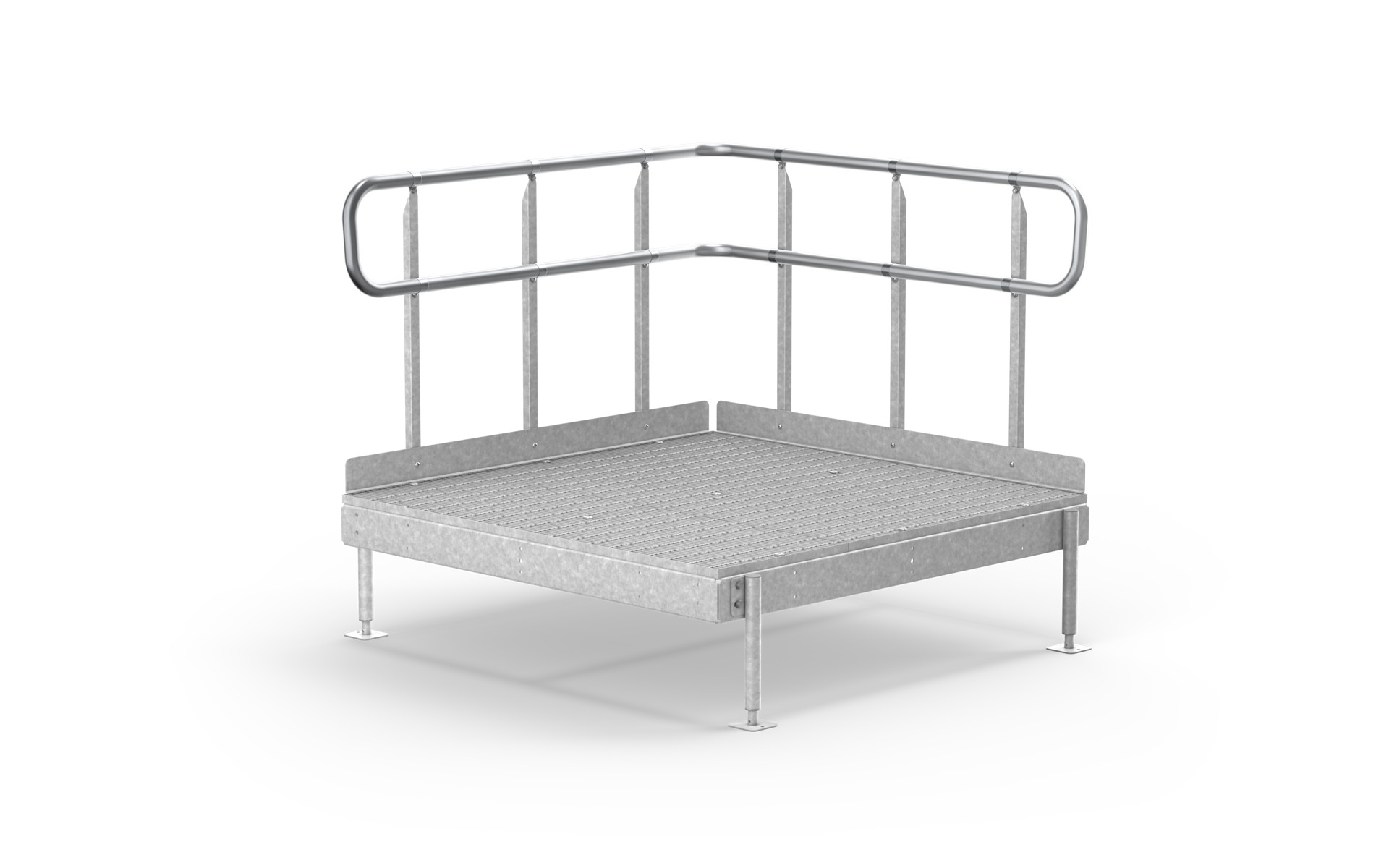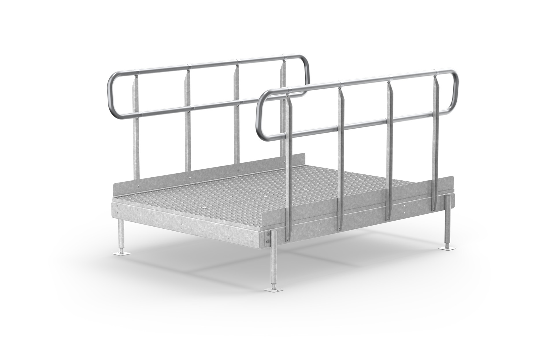 Passende Podeste werden ebenfalls zum Lager vorproduziert. Die Podeste bestehen aus einer Rahmenkonstruktion mit aufgelegtem Gitterrost. Einzelne Podeste können zu Ruhe-/ Wendepodeste zusammengefügt werden (z.B.: gegenläufige Rampen). Im öffentlichen Raum ist nach max. 6 m ein Ruhepodest vorzusehen. Die Baugruppen werden nach DIN EN-ISO 1461 verzinkt.